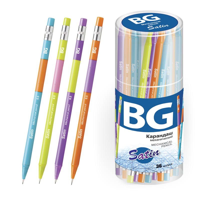 Надежный механический карандаш BG Satin с круглым корпусом цвета ассорти обладает нажимным механизмом подачи стержня. Твёрдость изделия – HB, диаметр грифеля 0,5 мм. Прочный металлический клип обеспечивает точный результат. Есть возможность смены грифеля.