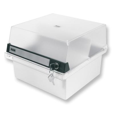Закрытая горизонтальная картотека Han формата А6 изготовлена из пластика светло-серого цвета, размеры — 250×175×145 мм. Прозрачная крышка оснащена ключевым замком. Картотека предназначена для удобного хранения и систематизации карточек и документов, например, трудовых книжек. Вмещает до 800 картонных карточек (в комплект не входят). Поставляется с одним пластиковым разделителем и одним прозрачным индексным окном. Всего можно установить до 16 разделителей (приобретаются отдельно).