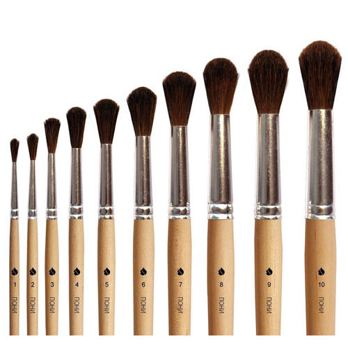 Кисть производится из верхнего конца волоса пони, кончик закруглен. Используется при работе с водорастворимыми красками. Цвет волоса светло- и темно-коричневый.