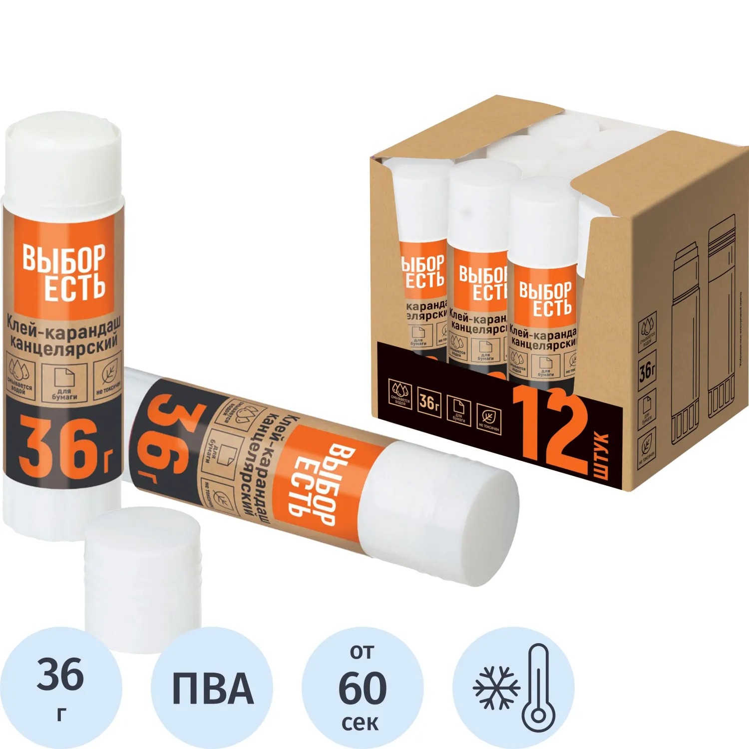 Клей-карандаш Выбор есть (Attache Economy) предназначен для склеивания бумаги, картона. Вес — 36 г. Круглая форма корпуса. Не содержит цветовых пигментов (бесцветный). Состав клея: ПВА. Склеивает бумагу от 60 до 90 секунд после нанесения клея. Легко смывается водой и отстирывается, не имеет запаха, быстро высыхает. Клей морозостойкий. Выдерживает 1 цикл заморозки/разморозки при температуре до −18 С.