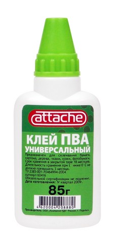 Клей ПВA Attachе, предназначенный для склеивания картона, бумаги и дерева. Подходит для декоративных работ. Допускается перевозка и хранение флакона при низких температурах (до −40°С). Качество после многократного размораживания не ухудшается. Съемный колпачок защищает от пересыхания. В одном флаконе содержится 85 г.