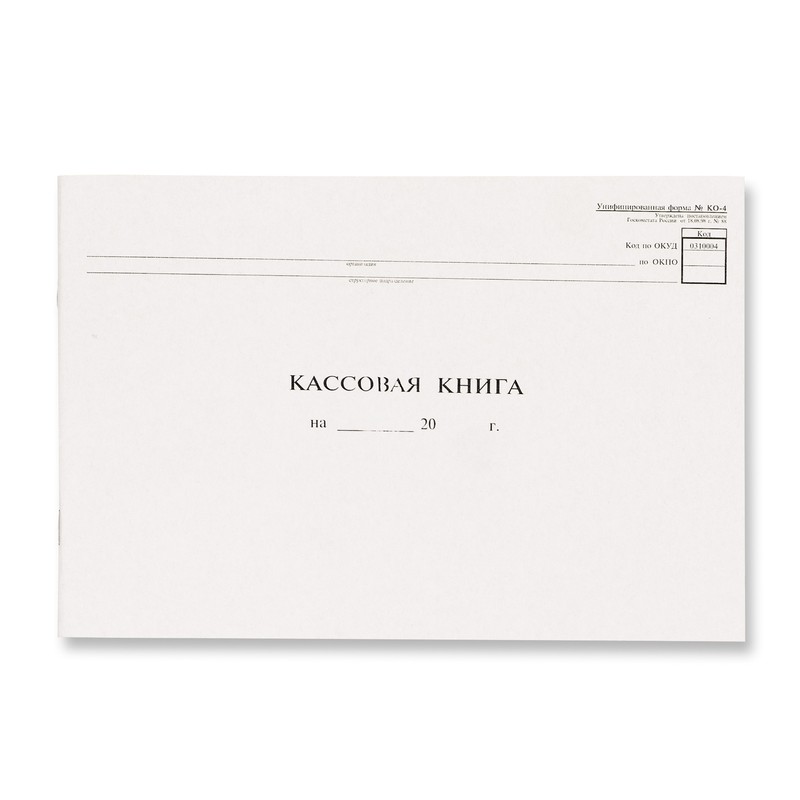 Бухгалтерская кассовая книга формы NКО-4 (формат А4, горизонтальная). Обложка изготовлена из картона. Внутренний блок — газетная бумага, 48 листов. Способ крепления — скрепки.