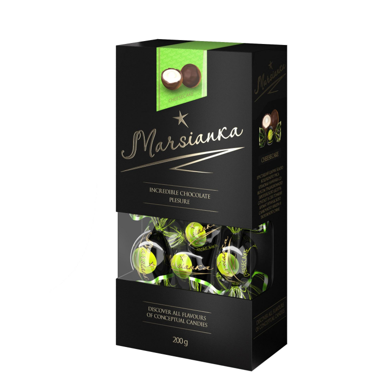 Конфеты Марсианка 'Чизкейк' - многослойное сочетание модных вкусов. Шоколадная глазурь, сладкая корочка, нежная начинка со вкусом чизкейка и хрустящее ядро. Вес - 200 г. Состав: сахар, жиры растительные, сыворотка молочная сухая деминерализованная, какао-порошок, рис воздушный с какао (крупа рисовая, сахар, мука пшеничная, какао-порошок, соль), патока, эмульгаторы: лецитин соевый, Е492; стабилизатор гуммиарабик, ароматизаторы. Пищевая ценность 100 г продукта (среднее значение): белки - 2,5 г, жиры - 38 г, углеводы - 55 г. Энергетическая ценность 100 г продукта (среднее значение): 2390 кДж / 570 ккал. Срок годности: 9 месяцев. Условия хранения: хранить при температуре 18(+3)°C и относительной влажности воздуха не более 75%. Производитель: ООО 'Сладкий Орешек'. Страна производства: Россия.