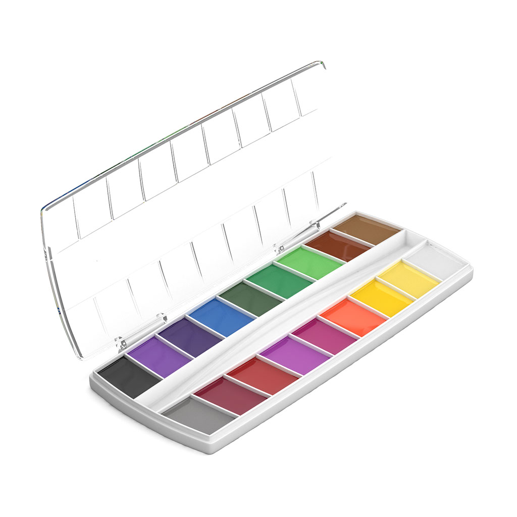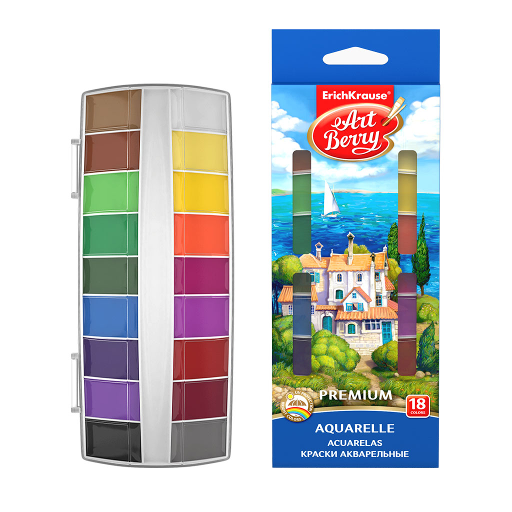 Акварельные краски ArtBerry® серии Premium с УФ защитой яркости в кюветах увеличенного объема и яркой цветовой палитрой представлены в практичном пенале. Конструкция пенала, позволяет загибать крышку под кюветы, а также легко её снимать и использовать в качестве палитры для смешивания красок.