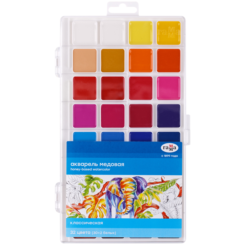 Медовая полусухая акварель ГАММА серии «Классическая» разработана для использования в школе и дома. Естественные цвета акварели обучают правильному цветовосприятию окружающего мира. Краски изготовлены на основе органических пигментов и натурального связующего. Прозрачность красок, яркость и чистота цвета, разносимость и размываемость — основные характеристики акварели данной серии. Кюветы с высокими бортиками и увеличенным расстоянием между красками предназначены для удобства в работе детей. Палитра для смешивания красок расположена на крышке. Акварель легко смывается с рук и отстирывается с одежды. Яркие краски 32 цветов разделены надёжными кюветами, благодаря которым цвета не смешаются при работе.