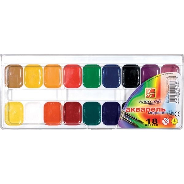 Краски акварельные «Классика» медовые полусухие изготовлены на основе органических пигментов и натурального связующего с добавлением пчелиного мёда, находятся в пластмассовой упаковке с прозрачной крышкой. Акварель предназначена для детского творчества и различных живописных работ.