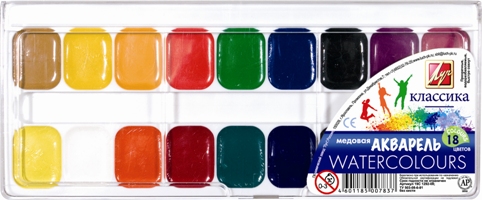 Краски акварельные «Классика» медовые полусухие изготовлены на основе органических пигментов и натурального связующего с добавлением пчелиного мёда, находятся в пластмассовой упаковке с прозрачной крышкой. Акварель предназначена для детского творчества и различных живописных работ.