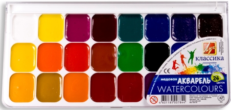 Краски акварельные «Классика» медовые полусухие изготовлены на основе органических пигментов и натурального связующего с добавлением пчелиного мёда, находятся в пластмассовой упаковке с прозрачной крышкой. Акварель предназначена для детского творчества и различных живописных работ.