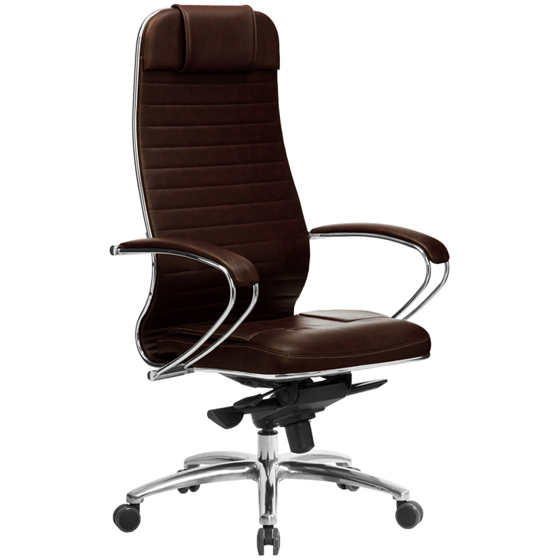 Каркас кресла: цельный стальной, покрытый зеркальным хромом; Подлокотники: износостойкие из натуральной кожи; Подголовник: износостойкий из натуральной кожи; Варианты обивки: сиденье и спинка из натуральной перфорированной кожи NewLeather; Пятилучье: стальное литое, покрытое зеркальным хромом; Механизм качания: "Мультиблок"; Ролики: полиуретановые; Рекомендуемая максимальная нагрузка: 150 кг.