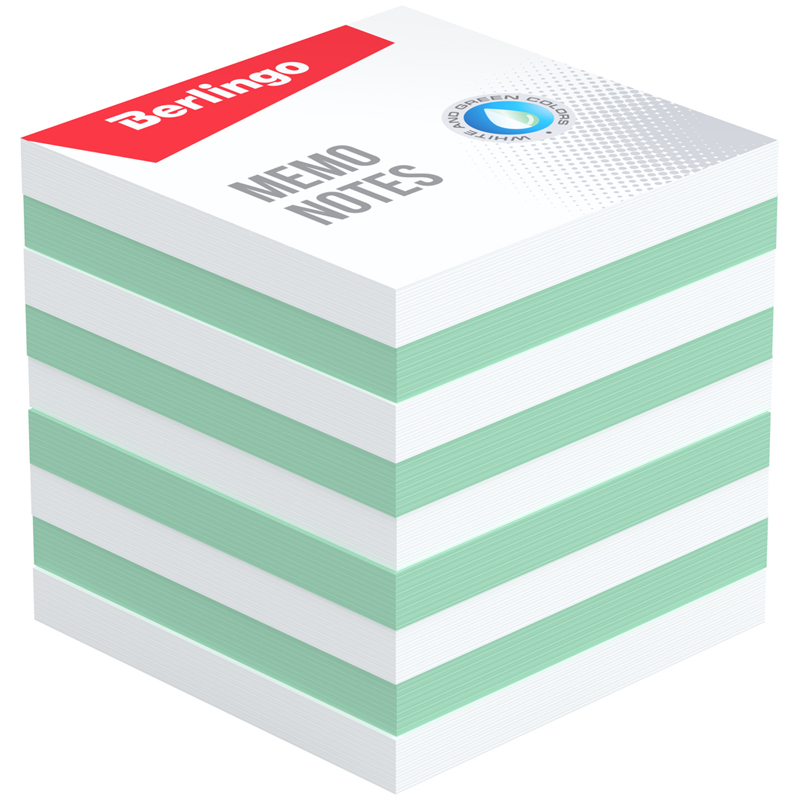 Блок сменный для оперативных записей. Чередование белого и зеленого цветов. Высота блока 90мм. Размер листа в блоке 90×90 мм. Бумага плотностью 80 г/м². Индивидуальная упаковка в термоусадочную пленку.