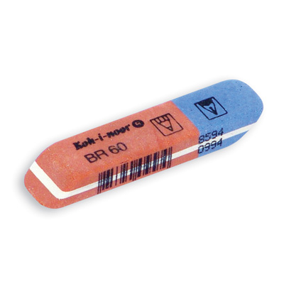Ластик KOH-I-NOOR сделан с добавлением натурального каучука. Одна сторона предназначена для стирания чернильных надписей, вторая— для графитовых. Цвет ластика комбинированный: голубой и оранжевый. Размер 50×18×7 мм.