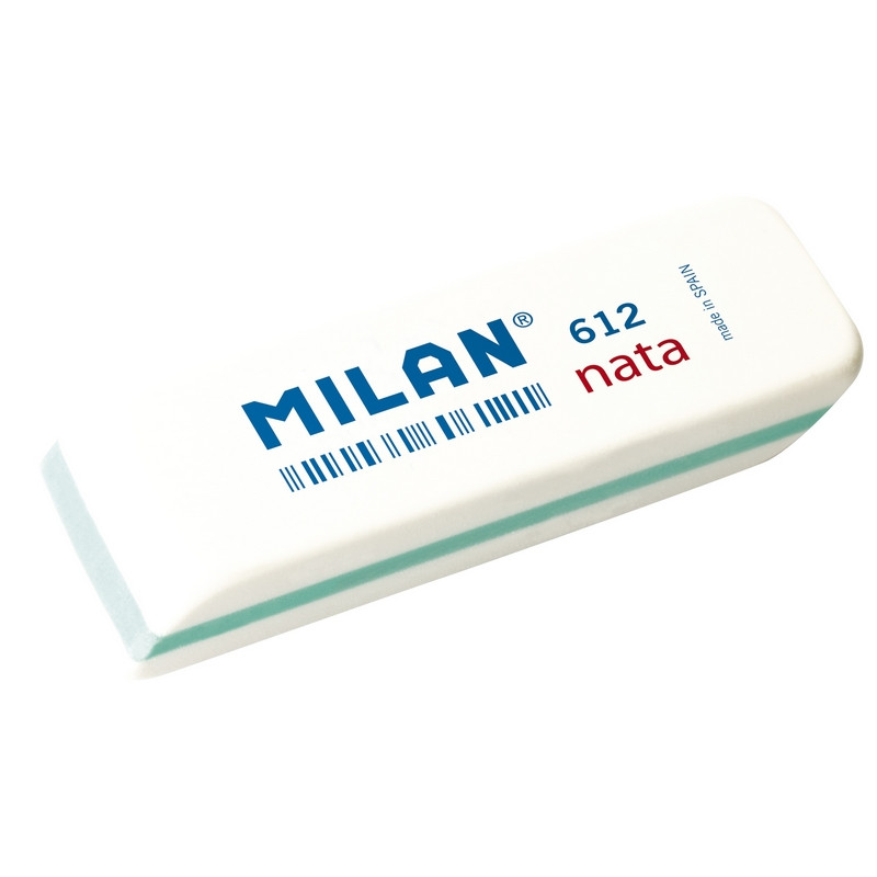 Белый пластиковый ластик Nata. Гладкий, универсальный и неабразивный. Стирает следы со всех поверхностей. Не повреждает бумагу. Белый скошенный ластик с бордюром разных цветов: синий, красный, зеленый. Размер ластика: 7,8 х 2,3 х 1,2 см.