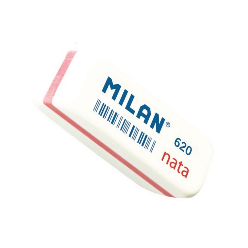 Белый пластиковый ластик Nata. Гладкий, универсальный и неабразивный. Стирает следы со всех поверхностей. Не повреждает бумагу. Белый скошенный ластик с бордюром разных цветов: синий, красный, зеленый. Размер ластика: 5,6 х 1,9 х 1,2 см.