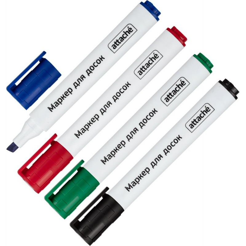 Набор высококачественных маркеров Attache Accent предназначен для письма на белых досках с магнитно-маркерной поверхностью. Представлены маркеры четырех цветов: черного, красного, синего, зеленого. Маркер для доски обладает круглым пластиковым корпусом белого цвета. Наконечник скошенной формы обеспечивает толщину линии письма 1-5 мм, в зависимости от силы нажатия на маркер и угла нанесения линии. Основа чернил - спиртовая. Чернила обеспечивают яркое выразительное письмо, быстро высыхают и не оставляют разводов. Надписи можно легко стереть только сухой губкой. Цвет колпачка соответствует цвету чернил. Изделие не перезаправляется. После применения рекомендуется плотно закрывать колпачок.