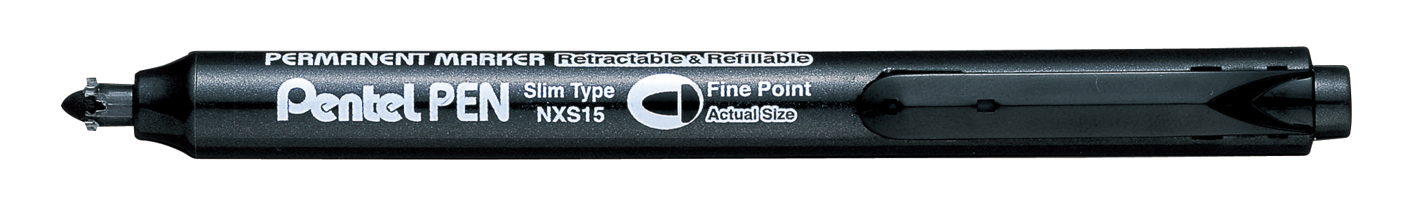 Pentel представляет первый автоматический перманентный маркер в мире. Маркер заправляется при помощи сменного картриджа. Автоматический маркер решает проблемы колпачков и предотвращает данную модель от высыхания. Предназначен для письма на всех видах гладких поверхностей. Изготовлен на 64% из переработанных материалов .