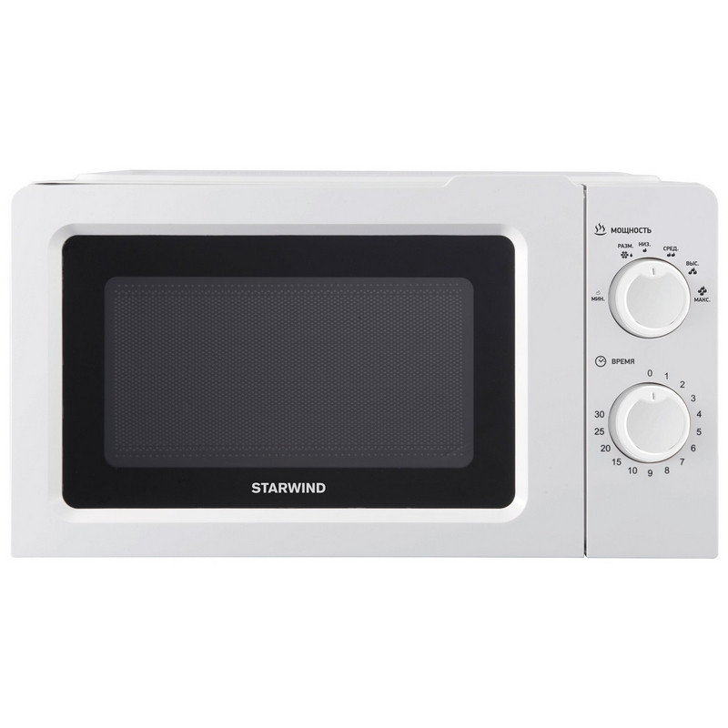 Микроволновая печь STARWIND SMW3020 внутренним объемом на 20 литров идеально впишется в интерьер даже небольшой кухни, а благодаря ее высокой производительности вы с легкостью сможете не только разогреть уже готовые блюда, но и приготовить свежие в разы быстрее, в сравнении с классическим способом приготовления в духовке или на пару. Мощность данной модели составляет 700 Вт, питание осуществляется от сети 220 Вт переменного тока с помощью сетевого кабеля. Корпус выполнен из металла и покрыт белой эмалью. Для открытия двери предусмотрена небольшая выступающая вверху ручка. Такое решение не только позволяет скрыть лишние элементы, но и упрощает уход за прибором. Также на самой дверце предусмотрено смотровое окошко, выполненное из специального жаропрочного стекла, не пропускающего микроволны, с помощью которого можно наблюдать за процессом приготовления или разогрева пищи. Управление в STARWIND SMW3020 механическое и для регулировки мощности или выбора времени работы предусмотрены две ручки-переключателя. Мощность регулируется в нескольких режимах: ?максимальная?, ?высокая?, ?средняя?, ?низкая? и режим ?разморозки?. Время работы прибора выставляется с интервалом в 1 минуту до 10 минут, а после до 30 минут, с интервалом в пять минут.