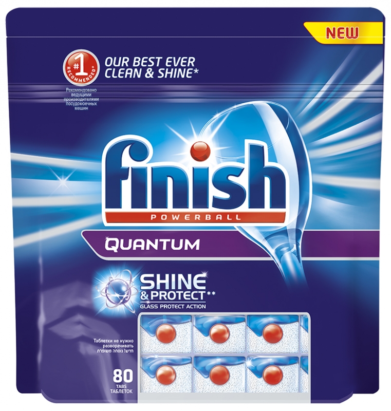 Таблетки Finish Quantum PowerBall — великолепное сияние и чистота всей вашей посуды в посудомоечной машине: от стаканов до вилок, ложек, от чайников до сковородок.