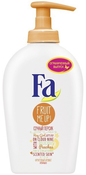 Насладись фруктовой революцией с крем-мылом Fa Fruit Me Up Сочный Персик разработанная формула с фруктовым ароматом бережно очищает кому, придавая ей ощущение свежести и непревзойденный аромат. Интригующий и вдохновляющий аромат сочного персика окутывает руки и пробуждает чувства. Для ощущения свежести и мягкости ножи. РН-нейтральный. Хорошая переносимость кожей подтверждена дерматологами.