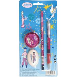 Ручка шариковая, диаметр шарика 0,7 мм, цвет чернил синий. Карандаш HB, точилка пластиковая с контейнером для мусора. Ластик круглый, диаметр 40 мм. В блистерной упаковке