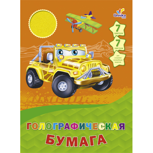Голографическая бумага 7л. 7цв. Формат 200х280 мм. Папка - мел. картон, с карманом и вырубкой. Инд. уп. Уп./гофр.
