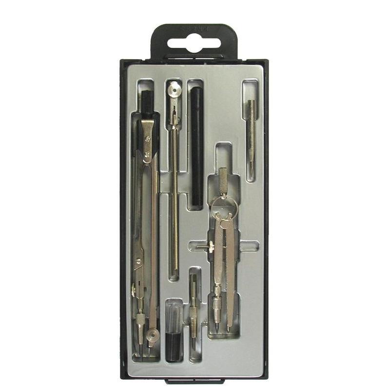 Набор чертежных принадлежностей, состоящий из 7-ми предметов — циркуль стальной никелированный (155 мм), кронциркуль стальной никелированный, пенал с запасным грифелем, карандашная вставка стальная, ручка пластмассовая, удлинитель стальной, игольная вставка стальная.