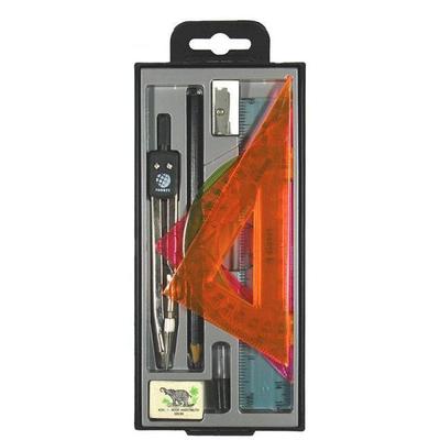 Готовальня «Глобус» (набор для черчения) состоит из девяти предметов — циркуль стальной никелированный (125 мм), пенал с запасным грифелем, карандаш черно-графитный деревянный, ластик резиновый, точилка пластмассовая, треугольник 30 градусов пластмассовый, треугольник 45 градусов пластмассовый, транспортир пластмассовый, линейка пластмассовая. Принадлежности упакованы в черный пластиковый пенал с прозрачной крышкой и подвесом. Набор предназначен для школьников средних и старших классов.