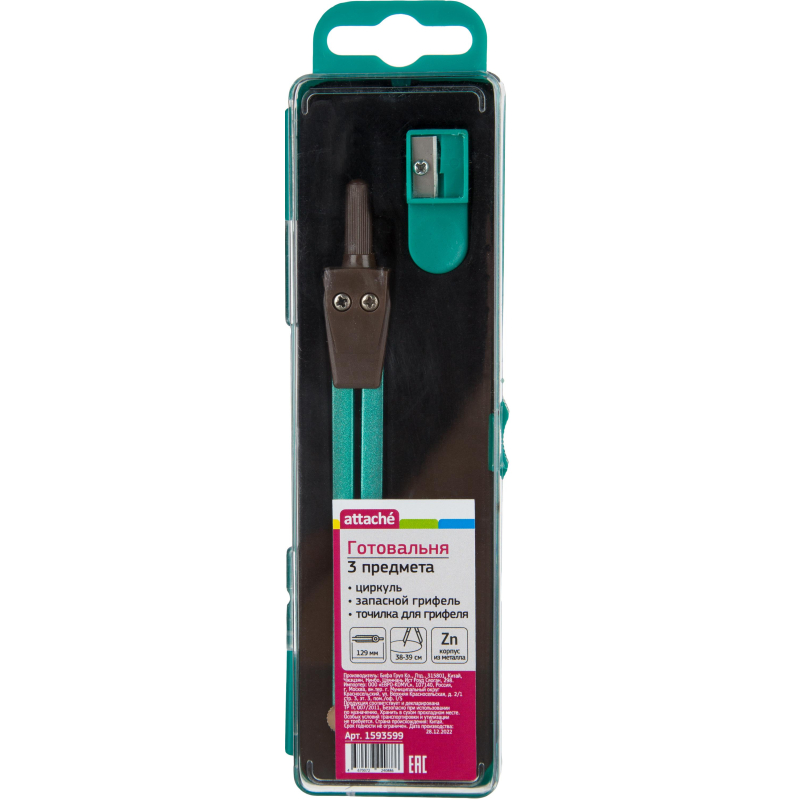 Набор чертежных принадлежностей из 3 предметов: циркуль (длина 129 мм), запасной грифель, точилка. Предназначен для школьников средних и старших классов, специалистов, архитекторов и конструкторов. Готовальня комплектуется ударопрочным пластиковым пеналом с европодвесом, что позволяет эффективно расположить товар и исключает повреждение во время транспортировки, а также сохраняет чертежные принадлежности исправными продолжительное время.