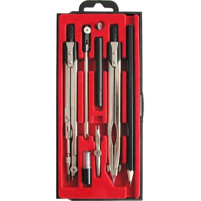 Состоит: циркуль стальной никелированный (155 мм), циркуль разметочный стальной никелированный (155 мм), пенал с запасным грифелем, карандашная вставка стальная, ручка пластмассовая, удлинитель стальной, запасной винт стальной, карандаш черно-графитный деревянный.