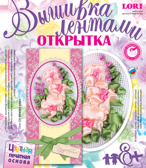 Комплектация: атласные ленты, канва, игла, нитки, цветная печатная основа для открытки, инструкция.