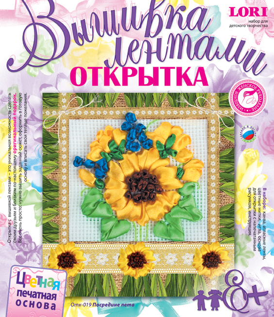 Комплектация: атласные ленты, канва, игла, нитки, цветная печатная основа для открытки, инструкция.