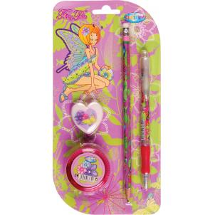 Ручка шариковая, диаметр шарика 0,7 мм, цвет чернил синий. Карандаш HB, точилка пластиковая с контейнером для мусора. Ластик диаметр 40 мм. В блистерной упаковке