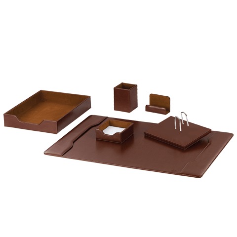 Лоток для бумаг. Стакан для письменных принадлежностей. Подставка для бумажного блока, размер подставки - 11,5x11,2x4,5 см. 200 листов блока в комплекте. Подставка для перекидного календаря. Подставка для визиток и писем. Настольный коврик для удобства письма. Размер: 64х44 см.