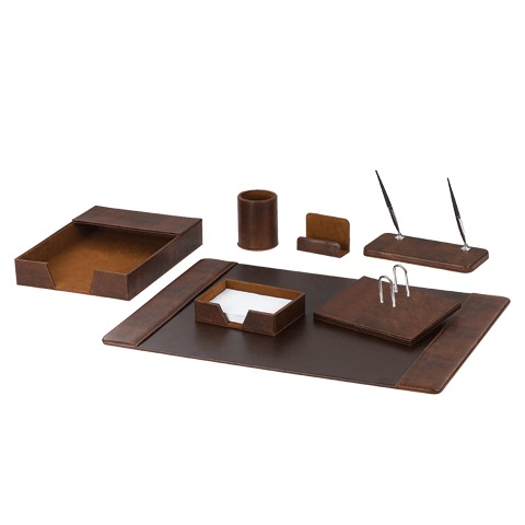 Настольный набор бизнес-класса оригинального дизайна с покрытием из искусственного материала коричневого цвета, имитирующего гладкую кожу. Отлично подходит для подарка руководителю, коллеге по бизнесу.
