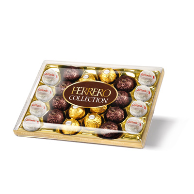 Набор Ferrero Collection — это ассорти из трех видов традиционных конфет марки Ferrero: в Ferrero Rocher, Ferrero Rondnoir и Raffaello. Каждый их трех видов имеет оригинальный вкус и состав. Это молочный шоколад и лесной орех, горький шоколад с кремовой начинкой и кокосовая конфета с цельным миндалем. Каждая конфета в пластиковой коробке имеет индивидуальную упаковку, всего в наборе по 8 штук каждого вида.