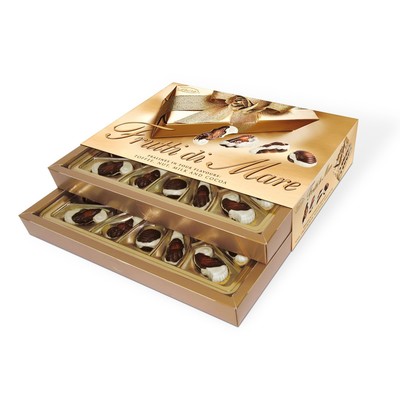 Frutti di Mare - это конфеты, в виде морских обитателей, из темного и белого шоколада, начиненный четырьмя начинками со вкусами: какао, ореховым, молочным и тоффи. Эти шоколадные ракушки с разным вкусом надолго оставляют приятные вкусовые впечатления, а их дополнительным достоинством является их неповторимая форма. Вместе образуют прекрасный сладкий подарок