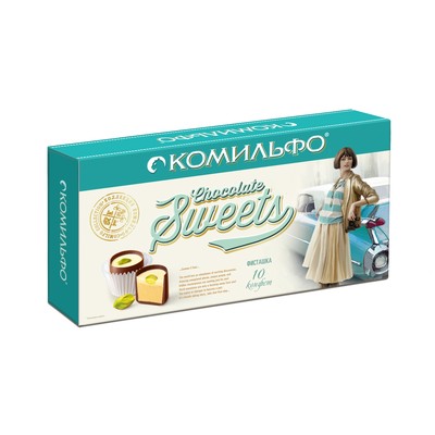 Шоколадные конфеты с двухслойной начинкой и орехом фисташка. Основная начинка выполнена из фисташкового пралине, дополнена кремом из белого шоколада. Поверхность украшена ядром фисташки. Шоколадные конфеты «Комильфо» имеют неповторимую цилиндрическую форму и отличаются сочетанием двух видов начинок, которые специально подобраны друг к другу, гармонично сочетаются и дополняют друг друга. В коробке 118г.
