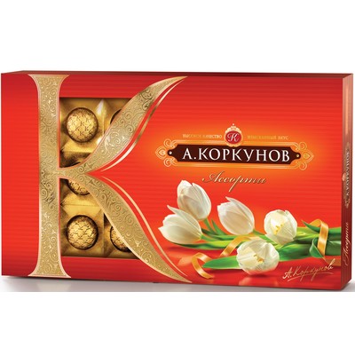 Конфеты «А.Коркунов» коллекции «Ассорти», изготовленные по уникальной рецептуре с использованием высококачественных отборных орехов. Шоколад произведен из лучших сортов какао-бобов — «Арриеро» (темный шоколад, начинка с дробленым лесным орехом), «Демонте» (молочный шоколад, начинка с дробленым лесным орехом), «Пуэррто» (темный шоколад, начинка с цельным лесным орехом). Набор представлен в картонной коробке с пластиковым коррексом внутри. Вес — 190 г. Пищевая ценность на 100 гр. продукта: белки — 7,5г, жиры — 36,1г, углеводы −49,3г. Энергетическая ценность на 100 гр. продукта: 549 ккал. Срок годности: 39 недель Условия хранения: от +5 до +21 Производитель: Одинцовская Кондитерская Фабрика Страна производства: Россия,ОКФ