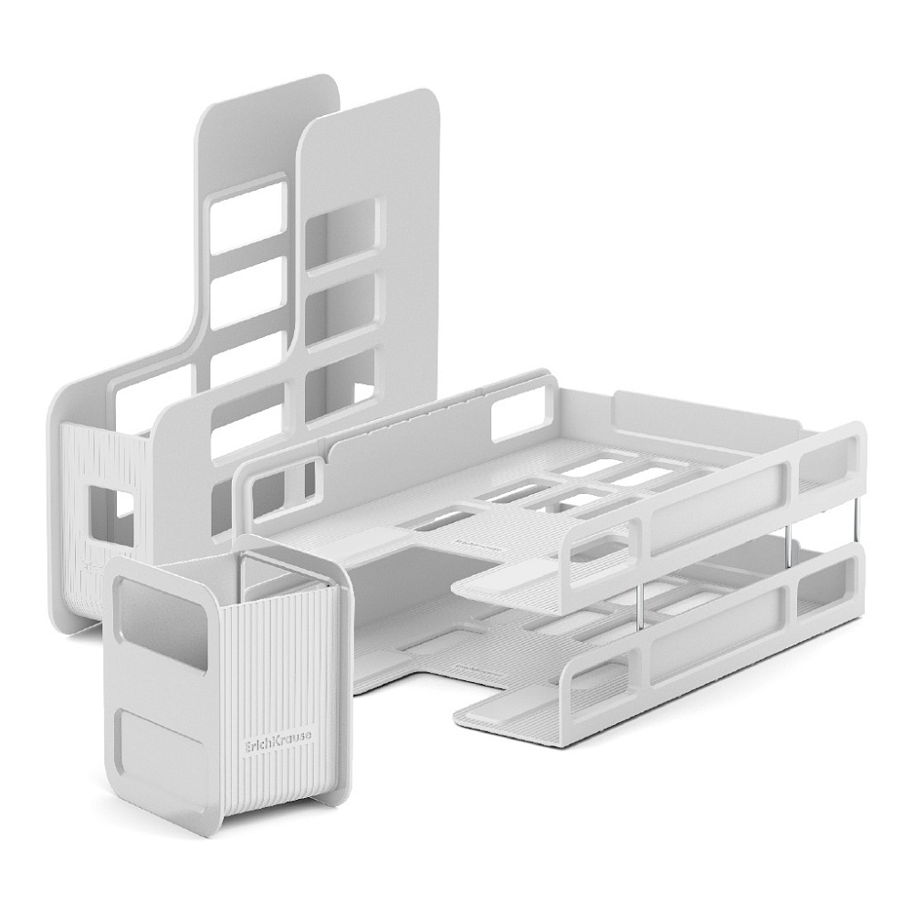 Настольный набор подставок изготовлен из высококачественного пластика. В комплекте 3 позиции модели Techno: набор из 2 лотков-трансформеров и вертикальная подставка для бумаг, подставка для пишущих принадлежностей.