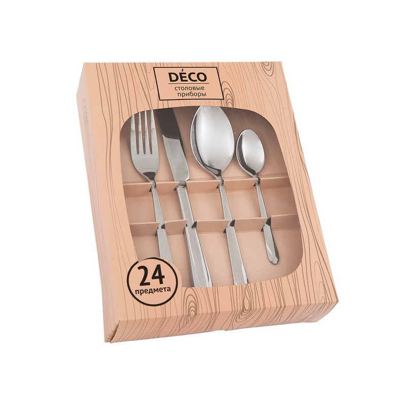 Набор столовых приборов Deco Alexandria на 6 персон изготовлен из высококачественной нержавеющей стали и совмещает в себе визуальную привлекательность и функциональность. Состав набора: Столовая ложка, 6 шт (длина 20,5 см). Столовая вилка, 6 шт (длина 20,5 см). Столовый нож, 6 шт (длина 24 см). Чайная ложка, 6 шт (длина 14 см). Столовые приборы выполнены из нержавеющей стали, которая отличается высокими антикоррозионными свойствами, значительной устойчивостью к воздействию кислот и щелочей. Такая сталь не изменяет вкус и цвет пищи, не выделяет вредных веществ. Набор можно мыть в посудомоечной машине. Стильный, лаконичный дизайн и отличное качество делают набор желанной покупкой для любого клиента. Набор можно использовать для сервировки, как дома, так и в ресторанах, и в кафе. Срок годности не ограничен.