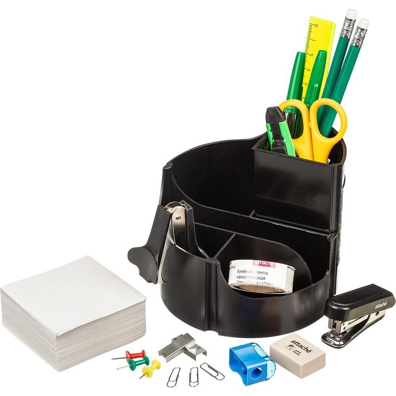 Настольный набор Attache Economy Оптима выполнен из пластика черного цвета. Подставка-трансформер, в зависимости от расположения лотка, количество отделений составляет 5 или 6. Включает 17 предметов: две шариковые ручки, два карандаша с ластиком, нож канцелярский, точилка, ластик, ножницы, линейка, степлер, скобы, скрепки, кнопки, блок-кубик, клейкая лента, антистеплер и подставку. Поставляется в термоусадочной пленке. Размеры изделия: 110x120 мм.