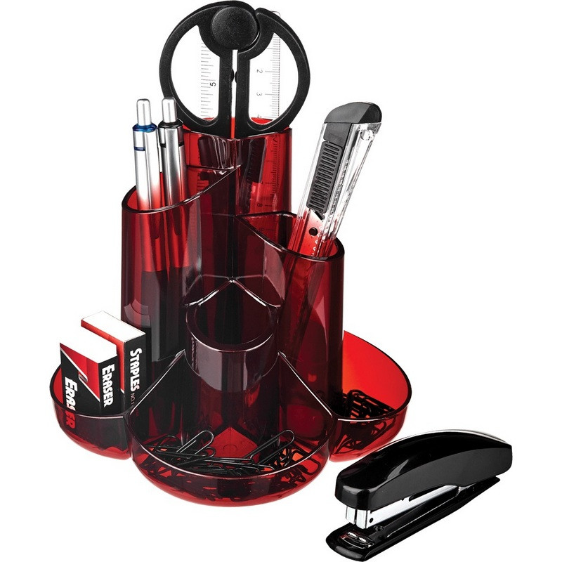 Настольный набор Attache Selection из высококачественного пластика, в который входит 10 предметов. Цвет: красный. В состав набора входят: подставка, ножницы, линейка, степлер, скобы, нож, ластик, скрепки, механический карандаш, автоматическая шариковая ручка. Размеры изделия (ДxШxВ): 128x128x130 мм.