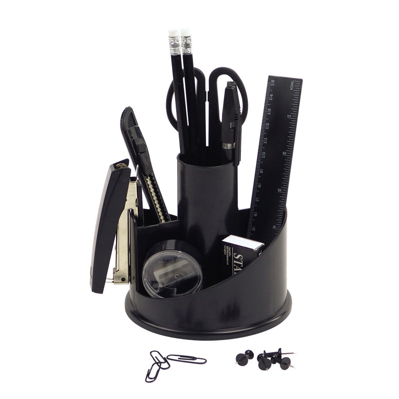 Настольный офисный набор Attache JC806 круглой формы изготовлен из черного пластика. Изделие оснащено вращающейся основой. Настольный офисный набор комплектуется ножницами, двумя карандашами с ластиком, канцелярским ножом, двумя шариковыми ручками, линейкой, скобами для степлера № 10, точилкой, степлером № 10, силовыми кнопками, скрепками и подставкой. Всего 14 предметов.