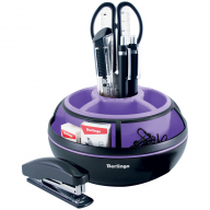 Артикул:MOn_09115. Название:Стильный канцелярский набор Berlingo "Instinct" с наполнением, с сочетанием двух цветов. Нежный фиолетовый пастельный цвет лаванда и контрастный черный. Высококачественный первичный пластик, блестящая поверхность, возможность вращения на 360 градусов. Качественное наполнение. В состав входят: механический карандаш, автоматическая шариковая ручка, степлер, ножницы, канцелярский нож, линейка, скрепки, ластик, скобы для степлера.