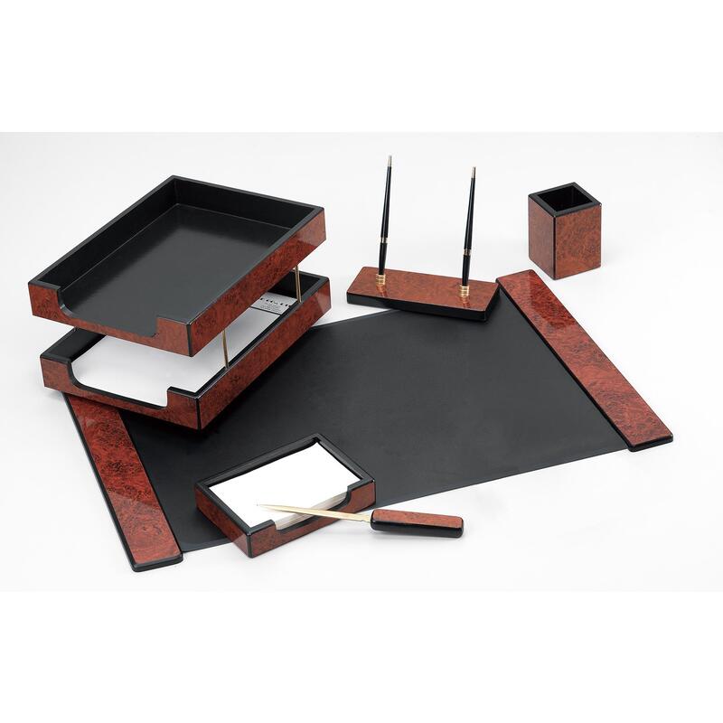 Офисный набор из дерева (темное дерево). В набор входит 6 предметов: коврик на стол, подставка для ручек (2 шариковые ручки в комплекте), подставка для заметок, подставка для карандашей, нож для вскрытия писем, двойной лоток для бумаг.
