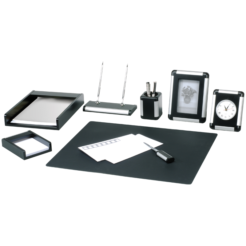 Классический стиль помогает аксессуарам с легкостью вписываться в любой интерьер, дополняя и обогащая его. Набор из натурального дерева придаст завершённый вид рабочему месту любого руководителя или сотрудника. В него входят: стакан для карандашей и ручек, подставка для бумажного блока, лоток для бумаг, подставка для ручек, настольное покрытие, нож для открывания писем и конвертов, часы настольные, фоторамка. Цвет - черное дерево.
