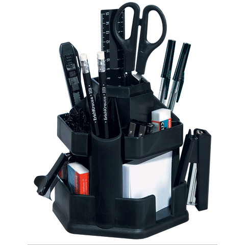 Готовый набор с наполнением. Подставка оснащена вращающимся механизмом и изготовлена из высококачественного пластика. В комплекте 12 предметов: 2 ручки, 2 карандаша, линейка, точилка, ластик, 30 скрепок, степлер №10, 1000 скоб, ножницы, нож канцелярский. Наполнение может отличаться от представленного.