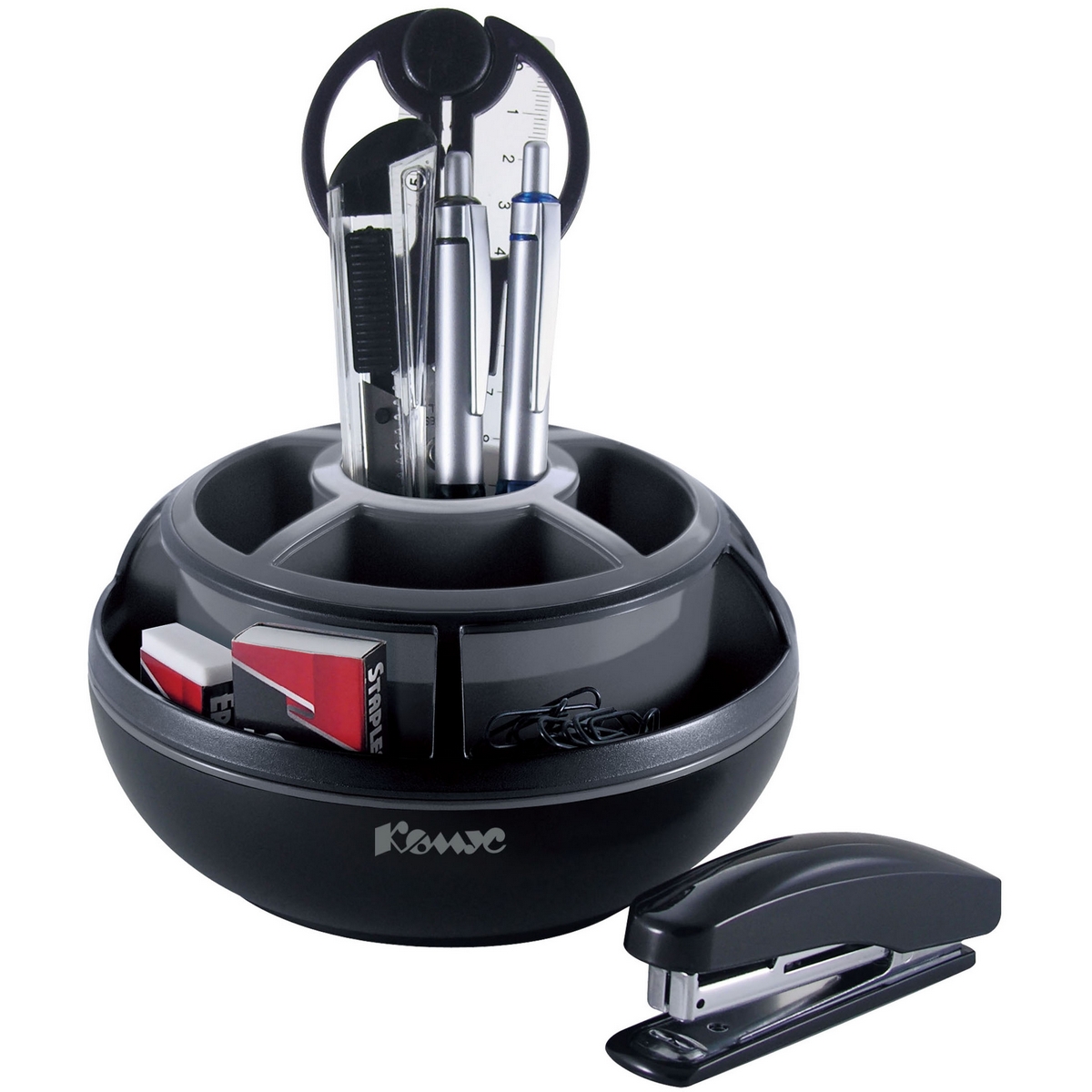Настольный канцелярский набор Комус выполнен из пластика в черно-сером цвете.Отличное решение для рабочего стола. Подставка занимает минимум места и вмещает в себя все нужны канцелярские мелочи для работы. Имеет вращающуюся на 360 градусов основу.Комплектация:подставка, ножницы, линейка, степлер № 10, скобы, нож, ластик, скрепки, механический карандаш (диаметр грифеля 0.7 мм), автоматическая шариковая ручка. Всего 10 предметов.