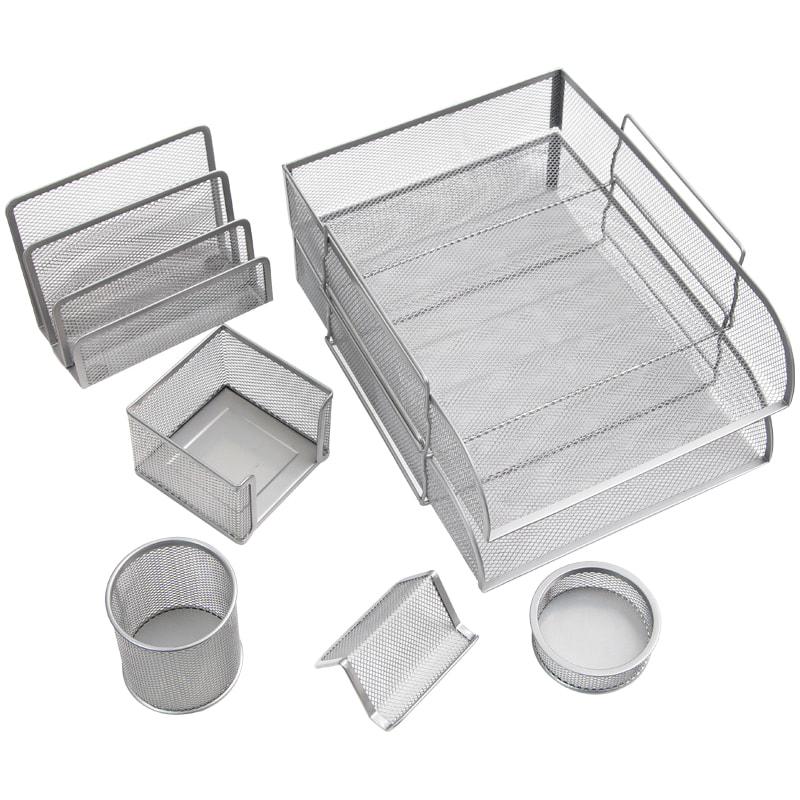 Стильный и функциональный набор из 7 предметов. Предметы изготовлены из металлической сетки. Упаковка в лакированную коробку. У подставки для бумаг, подставки для бумажного блока и подставки для пишущих принадлежностей имеются мягкие подушечки на дне, предотвращающие скольжение и повреждения поверхности. Серебристый цвет. Прочный корпус из высококачественного металла. Сетчатое исполнение предотвращает образование пыли внутри. В комплект набора входят 7 предметов: 2 поддона для бумаг формата А4 (поддоны устанавливаются друг на друга),