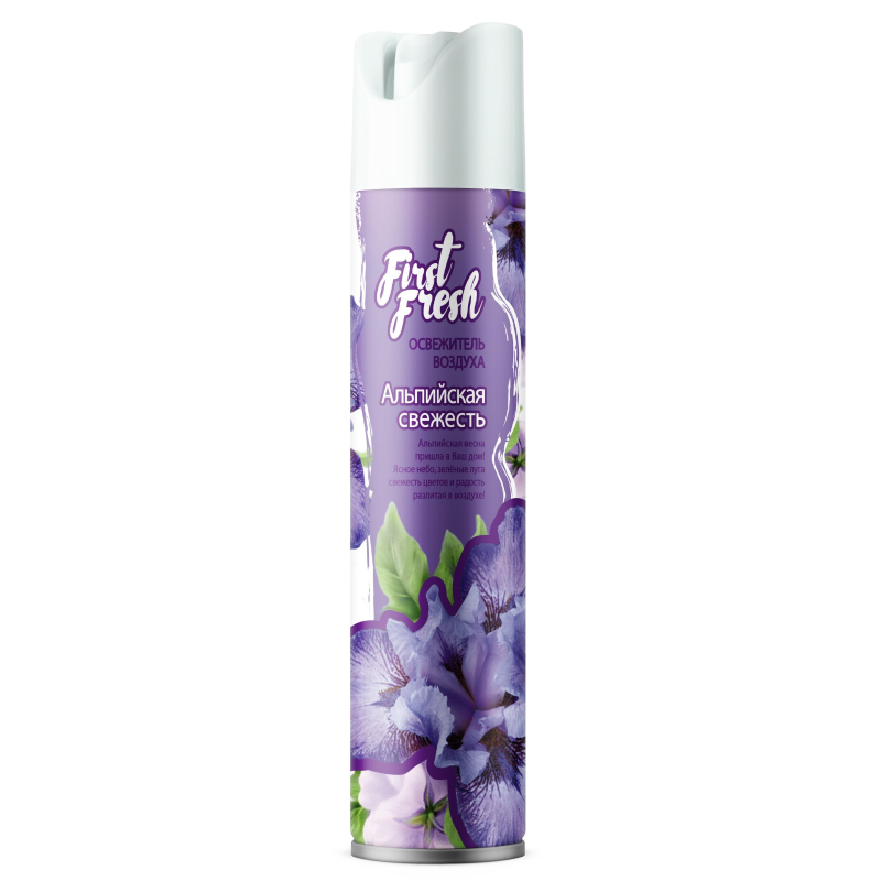 Освежитель воздуха First Fresh "Альпийская свежесть" 300 мл. Назначение: предназначен для устранения неприятных запахов в различных помещениях. Способ применения: баллон встряхнуть в течение 3-5 секунд. Держа баллон вертикально распылить вверх ближе к центру помещения в течение 2-3 секунд. При необходимости более длительного распыления баллон периодически встряхивать. Меры предосторожности: содержимое баллона находится под давлением. Предохранять от действия прямых солнечных лучей и нагревания выше 40 °С. Не вскрывать и не сжигать даже после использования! Не распылять вблизи открытого огня, источников тепла и раскаленных предметов! Не курить! Избегать попадания в глаза. Не разбирать и не давать детям.