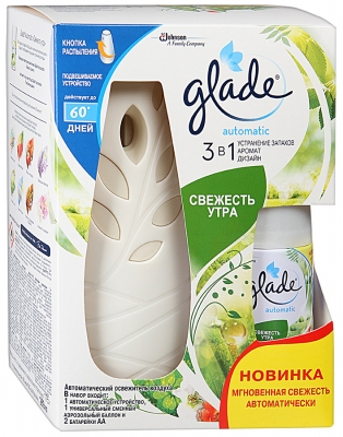 Glade Automatic - это автоматический освежитель воздуха, который равномерно дозирует аэрозоль. Устраняет неприятные запахи и наполняет комнату ароматами. В набор входит: 1 автоматическое устройство, 1 универсальный сменный аэрозольный баллон и 2 батарейки АА.